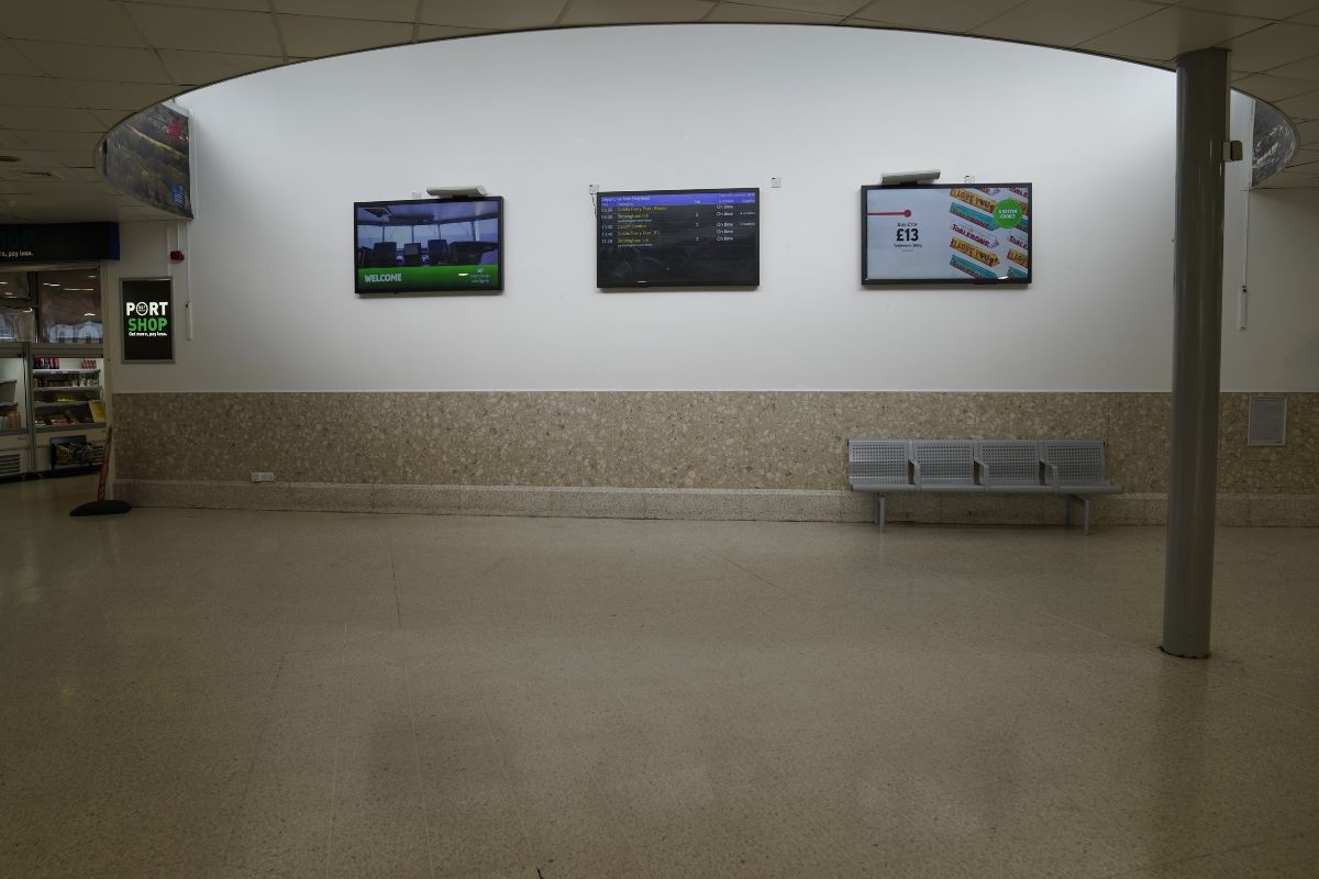 You enter the Holyhead port area by train, bus, or your own vehicle via a small roundabout, where cars can drive directly into the check-in. If you arrive too early, you can take the first exit to reach the short-stay parking. From there, you can stretch your legs and pay a visit to the terminal. The terminal has service counters, a shop, restrooms, and some seating.